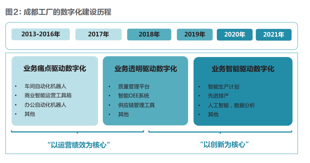 第一階段:業務痛點驅動。該階段工廠主要以“運營績效”為核心,重點關注問題解決。即:通過推進與辦公、生產等相關的自動化、數字化項目,解決痛點問題,持續提升生產效率,并將員工從低端重復勞動中解放出來。以車間自動化和辦公自動化為例:通過對已有產線的自動化升級改造,成都工廠不僅掌握了全自動產線的本地開發能力,而且有效提升了生產車間的自動化水平和生產質量;通過RPA、Mendix等低代碼工具的導入,成都工廠最大限度地替代了與辦公室相關的簡單重復工作。體現在數據層面,則是年均5%-10%的簡單重復工作被替代,尤其是在2016年工廠業務進入規?;A段后,前期基于業務痛點的自動化、數字化項目開始真正產生價值——2016年-2021年,成都工廠藍領人數增長100%、白領人數增長10%,而工廠產值增長超過300%。第二階段:業務透明驅動。該階段工廠從以“運營績效”為核心逐漸過渡到以“創新”為核心,更多關注透明帶來的業務機會。即:通過數字化手段讓工廠看不見的問題透明化并持續改進,隨著工廠端到端協同的不斷推進,員工也開始具備數字化思維,養成了使用數據說話的習慣。以質量管理平臺為例:通過質量管理平臺,成都工廠不僅實現了所有生產線上全部質量數據的全制造流程“實時”自動采集和全價值鏈的集成,而且全方位地“透明”質量運行狀態、100%追溯生產質量問題,從產品到材料、產線到工位等多維度實時呈現質量表現。得益于質量管理平臺的日常應用,工廠形成了“發現問題-解決問題”的質量管理閉環工作機制,從關注“是誰的問題”轉變為關注“如何解決問題”,推動了產品質量的持續改善——產品缺陷率從建廠初期的百萬分之8.4降至2022年5月的百萬分之5.7。第三階段:業務智能驅動。該階段工廠主要以“創新”為核心,關注基于數據的智能決策。即:通過不斷迭代的算法,替代人的經驗,建立集發現問題、分析、判斷及自主決策于一體的科學系統,提升員工對業務的理解,進而輔助決策、自主決策。以供應鏈風險預測為例:成都工廠日常生產涉及5000余種材料和上百家供應商,相應材料的供應風險識別和及時應對,對于工廠穩定經營至關重要。為此,成都工廠基于已有的原材料需求變化數據、供應商交付和質量表現數據,使用閉環優化的集成學習算法,對風險物料供應進行預測,并通過不斷迭代對算法進行優化,找出最優風險預測解。相較于傳統基于人工的物料供應預測,基于數據和算法的分析預測將預測準確率從46.65%大幅提升至80.40%。雖然成都工廠基于數據的智能決策尚處于起步階段,但以供應鏈風險預測為代表的嘗試,不僅讓員工對業務有了更好的理解和認知,而且基于算法提供的靈活預測方案,可以輔助員工基于業務變化快速做出決策,并有較好的決策解釋性。與成都工廠數字化建設相同步的,則是工廠組織變革的實現。隨著成都工廠數字化建設的推進,對組織變革的需求也愈加迫切,遂開始了全方位、漸進式的組織變革。