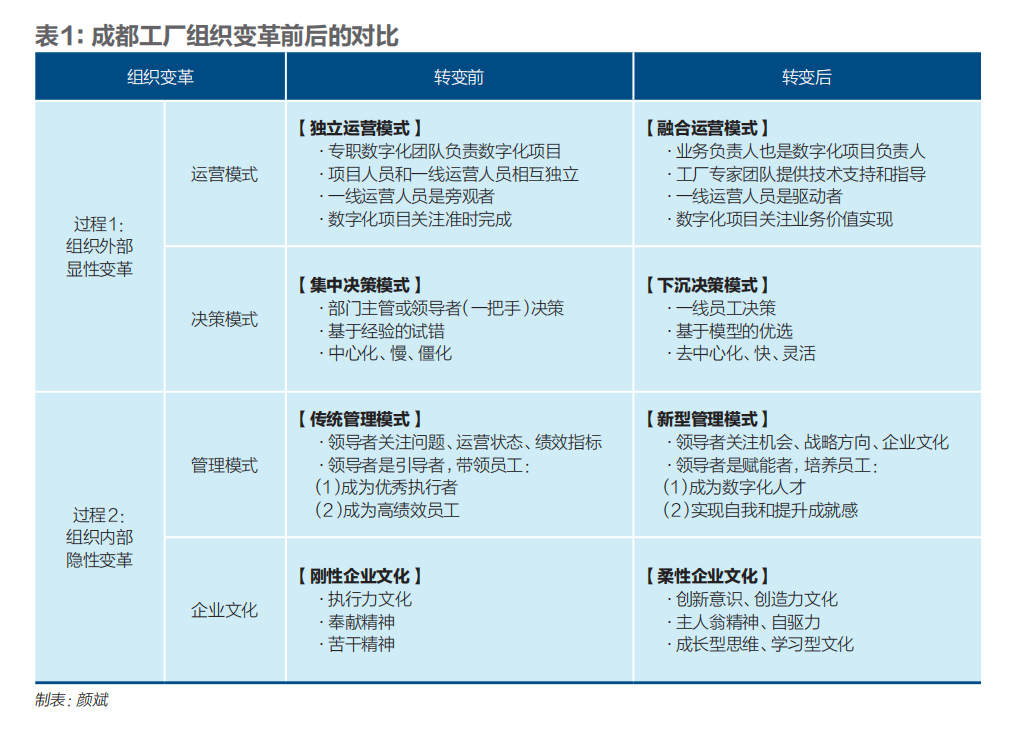 所謂全方位,即成都工廠推進并實現了從運營模式、決策模式、管理模式到企業文化的全方位組織變革;所謂漸進式,即成都工廠的組織變革經歷了“從外到內”的兩個重要過程,其一是體現在組織外部較為顯性的運營模式和決策模式的轉變,其二是體現在組織內部相對隱性的管理模式和企業文化的轉變,如表1所示。(1)組織外部的顯性變革:運營模式和決策模式的轉變很多企業非常重視數字化轉型,設立了專職項目團隊推進數字化項目,并將項目成果推廣至公司運營層面,但這往往造成運營與項目的錯位,即:項目組只關注項目的完成而不承擔運營績效、運營組只關注績效而不負責項目成敗。從成都工廠的轉型經驗來看,為確保數字化項目的有效落地、實現項目價值最大化,其組織變革的實現首先從運營模式轉型開始。成都工廠將數字化項目的實施納入到所有職能部門的業務規劃中,實現了運營和項目的有機結合,從部門主管到基層員工,工廠組織中的每個人都身擔雙重角色——數字化項目團隊成員和業務運營結果負責人。在相應運營模式下,成都工廠既保證了數字化項目與業務目標的一致、最大化實現業務價值,也推動了工廠決策模式的轉型。隨著運營模式的轉型,成都工廠的決策逐漸由基于少數人經驗、以控制為導向的集中決策模式,過渡為基于模型優選和算法迭代的智能決策。在智能決策下,工廠將決策權限更多地賦予一線基層員工,即決策下沉,形成了基層員工對業務負責的自驅力。這不僅讓工廠的決策更快,也讓工廠能夠更靈活地應對突發事件,更好地管理疫情、缺芯等帶來的供應鏈不確定性。(2)組織內部的隱性變革:管理模式和企業文化的轉變一般而言,在數字化轉型初期,企業領導者不僅需要親自推進和執行數字化項目,而且要鼓勵基層員工積極參與,并重點關注員工的任務完成情況。但當數字化被企業多數員工認可,轉型進入中后期時,企業管理模式也要隨之改變。成都工廠管理模式的轉型在于領導者與員工的漸進轉型,即員工從原來追求高績效的重復勞動者轉型為追求創新能力提升的數字化人才;領導者從原來負責運營結果轉型為負責持續創新、長期戰略和文化建設,并通過營造良好的環境,賦能和激勵員工在數字化項目中得到成長。具體地,領導者從關注問題轉變為關注機會、從關注短期績效轉變為關注長期發展、從關注項目執行能力轉變為關注企業創新能力、從關注員工任務完成轉變為關注員工能力成長。隨著成都工廠領導者逐漸從管理運營轉變為管理創新,以績效為核心的企業文化不再適用,更多需要以創新為代表的企業文化建設,這樣才能通過數字化實現企業真正的長期可持續發展。成都工廠自下而上創新文化的形成,關鍵在于員工自我價值的實現,這主要體現在“創新由基層員工驅動、讓基層員工更有成就感”這一理念。除此之外,成都工廠的創新文化理念還包括:(a)任何創新都要確保對業務產生價值;(b)創新是為了打破局限;(c)創新要小步快跑、不斷迭代;(d)創新需要開放的環境、永遠不怕失敗。除了創新文化,在成都工廠組織變革實踐中,逐漸成型的還有學習文化和信任文化。企業文化的轉型,不僅讓成都工廠全員更具有成長型、創新型和開放型思維,員工對自己更有信心、也更有成就感,而且,成都工廠領導者與員工之間形成了相互依存、相互信任的緊密關系,從而攜手推動數字化轉型。先進排產(Advance Scheduling)是體現成都工廠從運營模式到決策模式、再從管理模式到企業文化轉變,即推動組織變革確保項目產生價值、進而轉型成功的典型案例。先進排產項目涵蓋訂單、產品、設備、工裝夾具、人員、物料、工藝、生產節拍等眾多要素。傳統排產方式下,排產質量依靠長期積累的人工經驗、無法對緊急插單等情況做出快速反應。成都工廠在導入先進數字化技術和系統的基礎上,通過從運營到文化的系統性組織變革,實現了排產效率提升、供應鏈響應速度加快和產品穩定交付三大目標。(a)運營模式轉變。在先進排產項目導入過程中,工廠一線排產員工既主導整個項目的功能需求規劃和實施,又負責項目后續試點和推廣,并對結果負責。具體地,一線排產員工基于對排產相關痛點問題的深刻理解,并結合工廠產品、工藝和供應鏈模式等特點,制定出“以滿足交付為前提、實現生產效率最大化”的排產策略。這種由排產人員推進數字化項目、將排產目標和項目有機結合的運營模式,讓排產人員既不擔心被工具替代,也不用擔心被迫使用不實用的工具,確保了先進排產項目由一線需求驅動,真正對業務產生價值。(b)決策模式轉變:先進排產項目不僅確保了準時交付、提升了設備利用率等可量化的指標,而且優化了與排產有關的決策模式。即:隨著排產模型的不斷優化,模型給出的排產結果逐漸優于經驗,工廠從原來由生產和供應鏈主管決定生產什么、生產多少的“粗放式”決策模式,轉變為由一線員工基于先進排產優化算法“精準”決策的模式。在后一種模式下,生產什么、生產多少、何時生產、需要什么資源都清晰可見,甚至在遇到緊急或異常情況時,也能夠閉環反饋并快速調整生產計劃,這讓工廠生產排程決策的質量和靈活性均得以大幅提升。(c)管理模式轉變。隨著先進排產在工廠內應用的逐漸成熟,工廠的管理模式也相繼發生改變。
